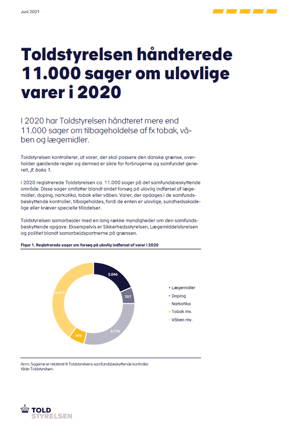 05-07-2021Toldstyrelsen håndterede 11.000 sager om ulovlige varer i 2020I 2020 har Toldstyrelsen håndteret mere end 11.000 sager om tilbageholdelse af fx tobak, våben og lægemidler. Hent publikation som pdf