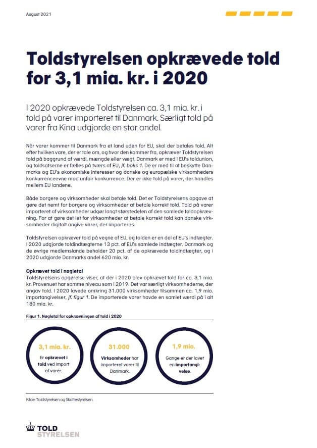 24-08-2021Toldstyrelsen opkrævede told for 3,1 mia. kr. i 2020I 2020 opkrævede Toldstyrelsen ca. 3,1 mia. kr. i told på varer importeret til Danmark. Særligt told på varer fra Kina udgjorde en stor andel. Hent publikation som pdf