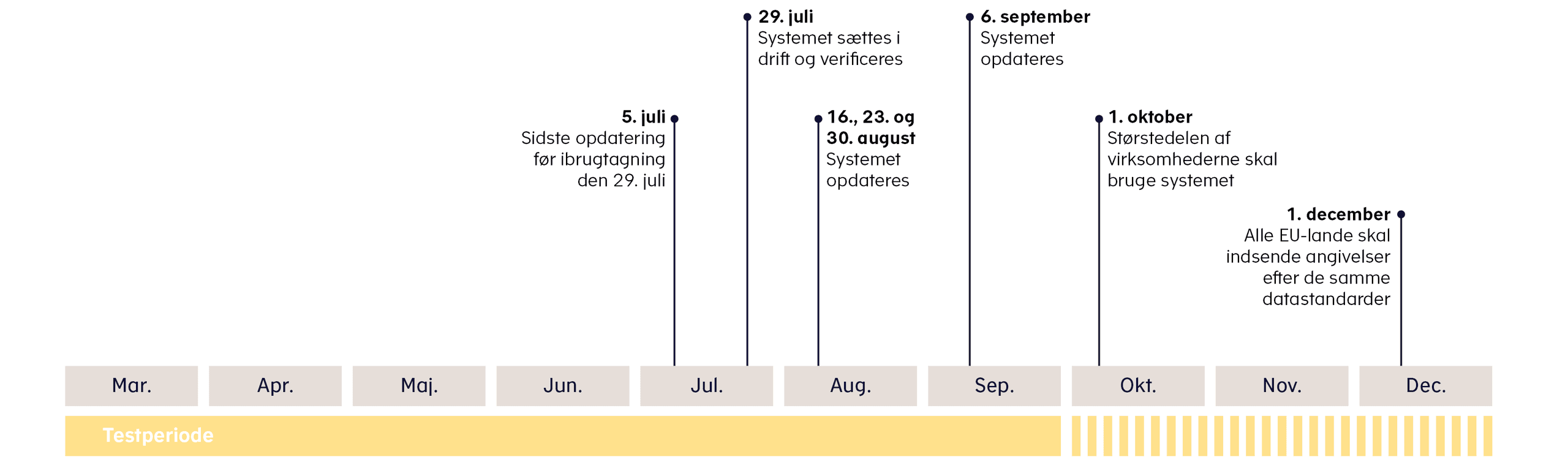 5. juli forventer vi at have den allersidste opdatering af systemet i testmiljøet inden ibrugtagning 29. juli. Det, som virksomhederne oplever i testmiljøet fra 5. juli, er altså også det, de vil møde, når systemet kan tages i brug. Det giver en lille måned, hvor vi sikrer stabilitet i systemet til gavn for både virksomheder og Toldstyrelsen.